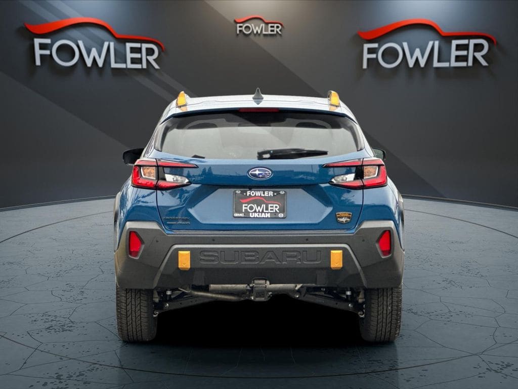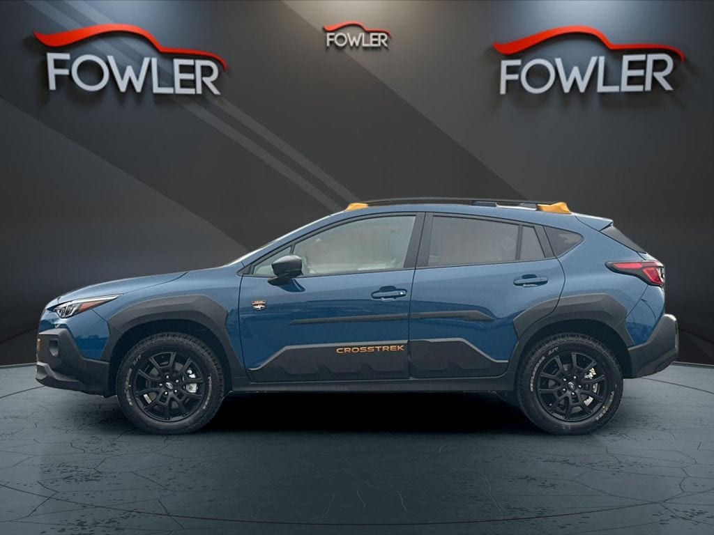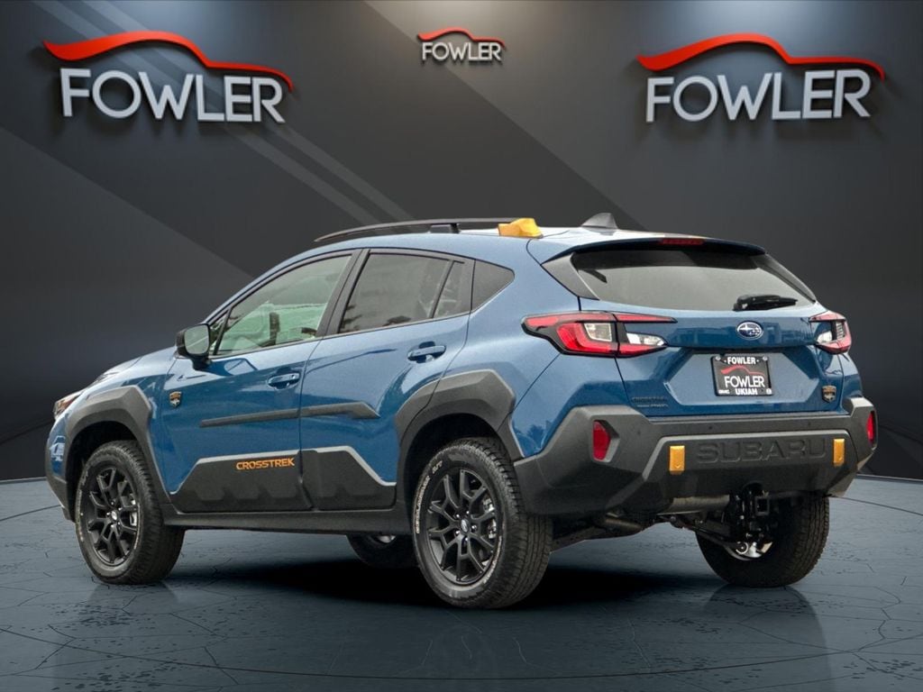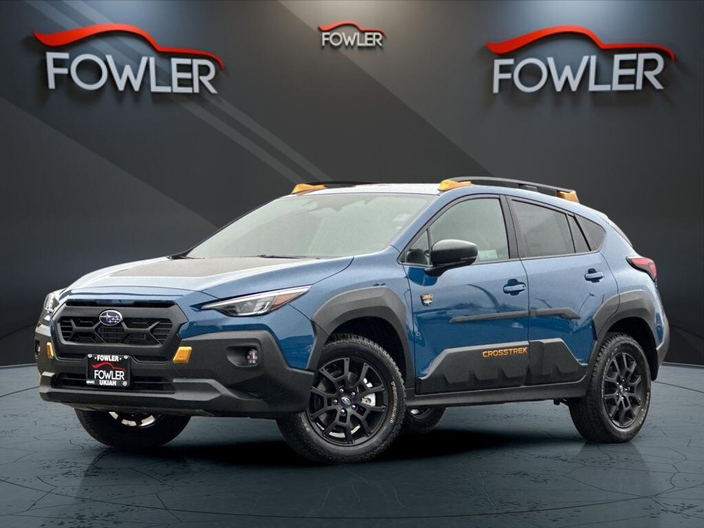 Blue 2025 Subaru Crosstrek Wilderness AWD Lineartronic CVT 2.5L 4-Cylinder DOHC 16V 4-Wheel Disc Brakes, 6 Speakers, ABS brakes, Air Conditioning, Alloy wheels, AM/FM radio: SiriusXM, Anti-whiplash front head restraints, Auto High-beam Headlights, Automatic temperature control, Brake assist, Bumpers: body-color, Driver door bin, Driver vanity mirror, Dual front impact airbags, Dual front side impact airbags, Electronic Stability Control, Emergency communication system, Exterior Parking Camera Rear, Four wheel independent suspension, Front anti-roll bar, Front Bucket Seats, Front Center Armrest, Front dual zone A/C, Front fog lights, Front reading lights, Fully automatic headlights, Heated door mirrors, Heated Front Bucket Seats, Heated front seats, Illuminated entry, Knee airbag, Leather Shift Knob, Leather steering wheel, Low tire pressure warning, Occupant sensing airbag, Outside temperature display, Overhead airbag, Overhead console, Panic alarm, Passenger door bin, Passenger vanity mirror, Power door mirrors, Power steering, Power windows, Radio data system, Radio: Subaru 11.6" Multimedia Plus System, Rear anti-roll bar, Rear seat center armrest, Rear window defroster, Rear window wiper, Remote keyless entry, Security system, Speed control, Speed-sensing steering, Split folding rear seat, Spoiler, Steering wheel mounted audio controls, Tachometer, Telescoping steering wheel, Tilt steering wheel, Traction control, Trip computer, Turn signal indicator mirrors, Variably intermittent wipers, Wheels: 17" x 7.0" J Matte Black Aluminum-Alloy, Wilderness StarTex Upholstery.
