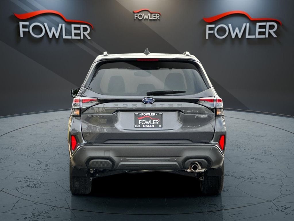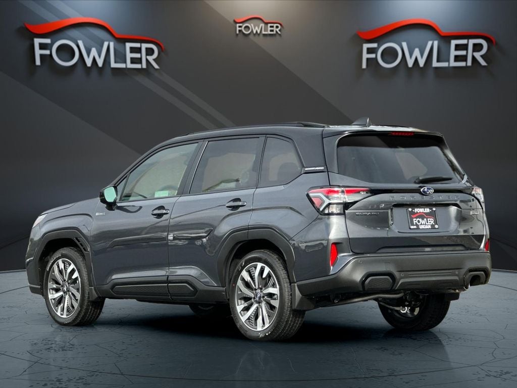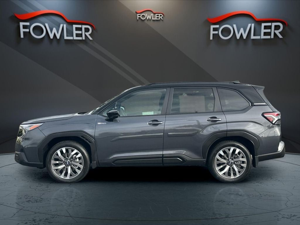 Magnetite Gray Metallic/Crystal Black Silica 2025 Subaru Forester Hybrid Touring AWD Lineartronic CVT 2.5L 4-Cylinder DOHC 16V 2.5L 4-Cylinder DOHC 16V, 11 Speakers, 4-Wheel Disc Brakes, ABS brakes, Air Conditioning, Alloy wheels, AM/FM radio: SiriusXM with 360L, Anti-whiplash front head restraints, Auto High-beam Headlights, Automatic temperature control, Body Side Molding - Magnetite Gray Metallic, Brake assist, Bumpers: body-color, Center Console Tray, Compass, Driver door bin, Driver vanity mirror, Dual front impact airbags, Dual front side impact airbags, Electronic Stability Control, Emergency communication system: MySubaru Safety (3-year free trial), Exterior Parking Camera Rear, Four wheel independent suspension, Front anti-roll bar, Front Bucket Seats, Front Center Armrest, Front dual zone A/C, Front fog lights, Front reading lights, Fully automatic headlights, harman/kardon® Speakers, Heated & Ventilated Front Bucket Seats, Heated door mirrors, Heated front seats, Heated rear seats, Heated steering wheel, HVAC memory, Illuminated entry, Knee airbag, LED Upgrade, Low tire pressure warning, Memory seat, Navigation system: TomTom Navigation w/what3words, Occupant sensing airbag, Outside temperature display, Overhead airbag, Overhead console, Panic alarm, Passenger door bin, Passenger vanity mirror, Perforated Leather-Trimmed Upholstery, Power door mirrors, Power driver seat, Power Liftgate, Power moonroof: Panoramic, Power passenger seat, Power steering, Power windows, Radio data system, Radio: Subaru 11.6" Multimedia Navigation System, Rear anti-roll bar, Rear Bumper Cover, Rear seat center armrest, Rear Seatback Protector, Rear window defroster, Rear window wiper, Remote keyless entry, Security system, Speed control, Speed-sensing steering, Splash Guards, Split folding rear seat, Spoiler, Standard Model, Steering wheel mounted audio controls, Sunshade - Windshield, Tachometer, Telescoping steering wheel, Tilt steering wheel, Traction control, Trip computer, Turn signal indicator mirrors, Variably intermittent wipers, Ventilated front seats, Wheels: 19" x 7.5 J Dark Gray Aluminum-Alloy, 2.5L 4-Cylinder DOHC 16V.