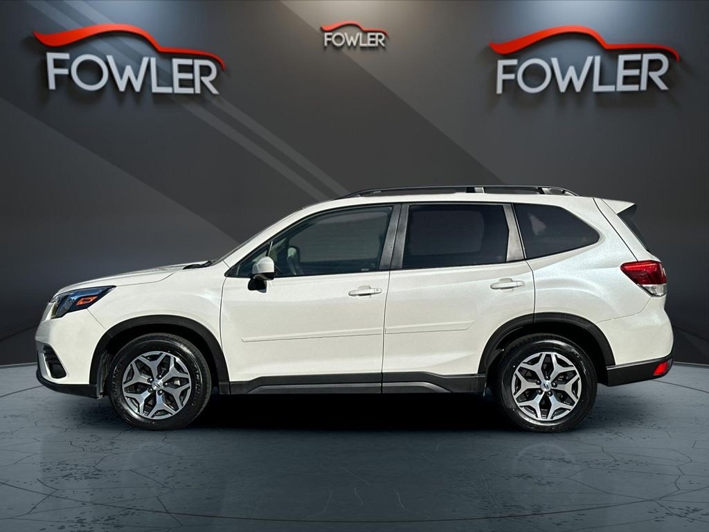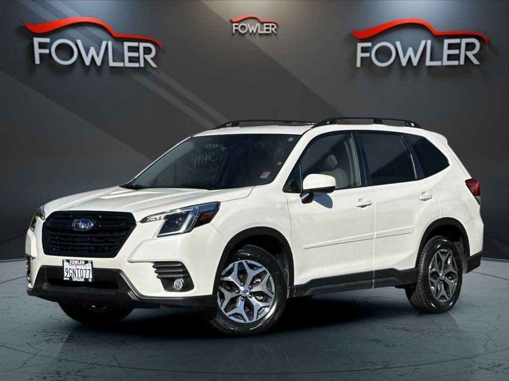 Crystal White Pearl 2023 Subaru Forester Premium AWD Lineartronic CVT 2.5L 4-Cylinder DOHC 16V 3.70 Axle Ratio, 4-Wheel Disc Brakes, 6 Speakers, ABS brakes, Air Conditioning, Alloy wheels, AM/FM radio: SiriusXM, Anti-whiplash front head restraints, Auto High-beam Headlights, Automatic temperature control, Blind Spot Detection w/RCTA & Power Rear Gate, Blind-Spot Detection (BSD), Body Side Molding - Crystal White Pearl, Brake assist, Bumpers: body-color, CD player, Driver door bin, Driver vanity mirror, Driver's Seatback Divided Pocket, Dual front impact airbags, Dual front side impact airbags, Dual USB Charge Ports, Electronic Stability Control, Emergency communication system: STARLINK Safety and Security (Subscription Required), Exterior Parking Camera Rear, EyeSight System, Four wheel independent suspension, Front anti-roll bar, Front Bucket Seats, Front Center Armrest, Front fog lights, Front reading lights, Fully automatic headlights, Heated door mirrors, Heated Front Bucket Seats, Heated front seats, Illuminated entry, Knee airbag, Low tire pressure warning, Multi-Function High Grade Display, Occupant sensing airbag, Outside temperature display, Overhead airbag, Overhead console, Panic alarm, Passenger door bin, Passenger vanity mirror, Power door mirrors, Power driver seat, Power moonroof: Panoramic, Power Rear Gate, Power steering, Power windows, Premium Cloth Upholstery, Radio data system, Radio: Subaru Starlink 6.5" Multimedia Plus System, Rear anti-roll bar, Rear seat center armrest, Rear window defroster, Rear window wiper, Remote keyless entry, Roof rack: rails only, Security system, Speed control, Speed-sensing steering, Split folding rear seat, Spoiler, STARLINK/Apple CarPlay/Android Auto, Steering wheel mounted audio controls, Tachometer, Telescoping steering wheel, Tilt steering wheel, Traction control, Trip computer, Variably intermittent wipers, Wheels: 17" x 7.0 J Black Machine Finish Alloy.